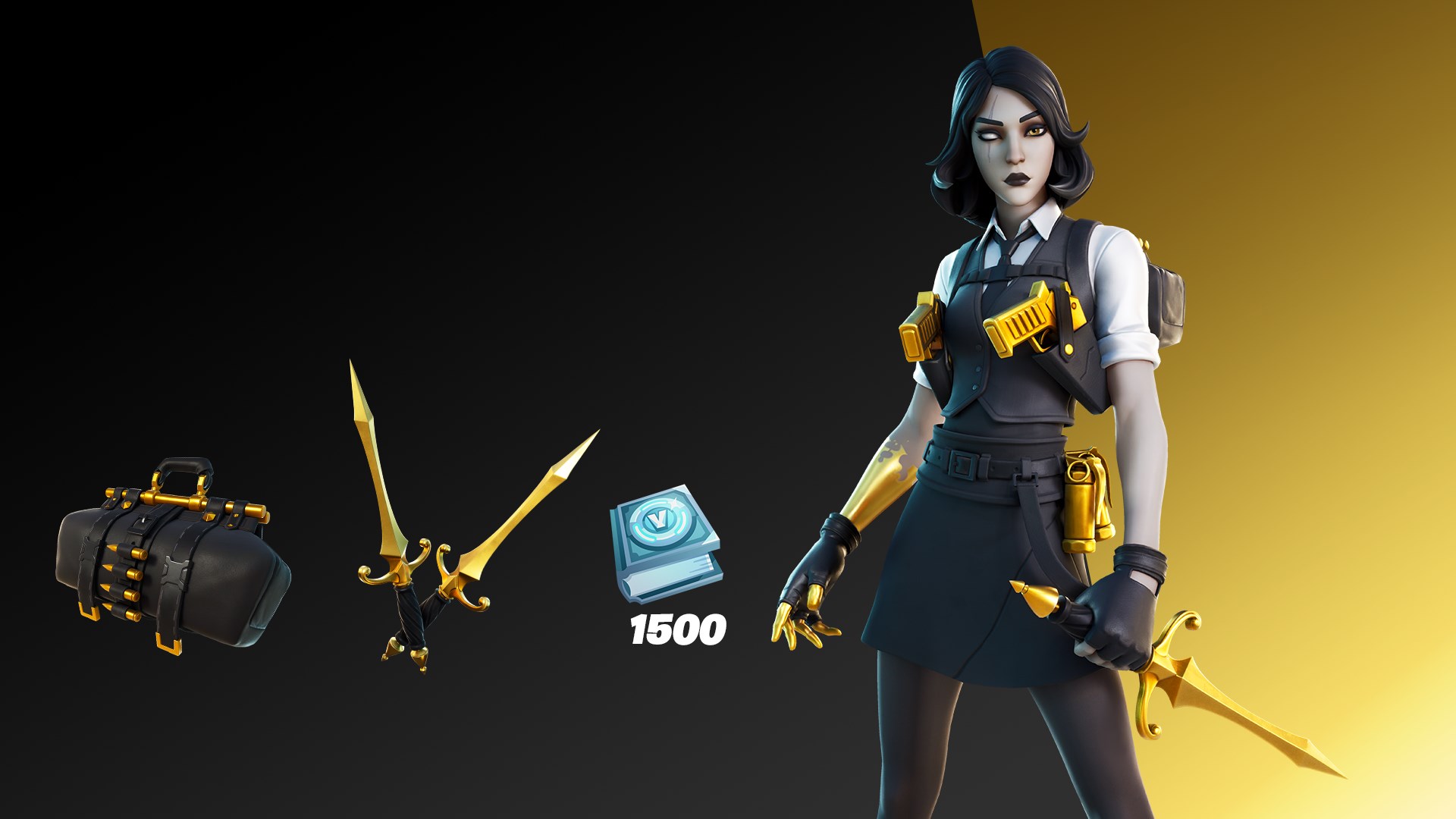 This Pack contains the cosmetics of the Golden Touch Set and 1, 500 V-Bucks. Contains items:Marigold Outfit (Female Midas)Golden Gambit Back BlingGolden Daggers PickaxeGolden Touch Challenges (earn up to 1, 500 V-Bucks)Reactive: Outfit and Back Bling become more gold with each elimination! Weapons Marigold picks up can turn to gold!