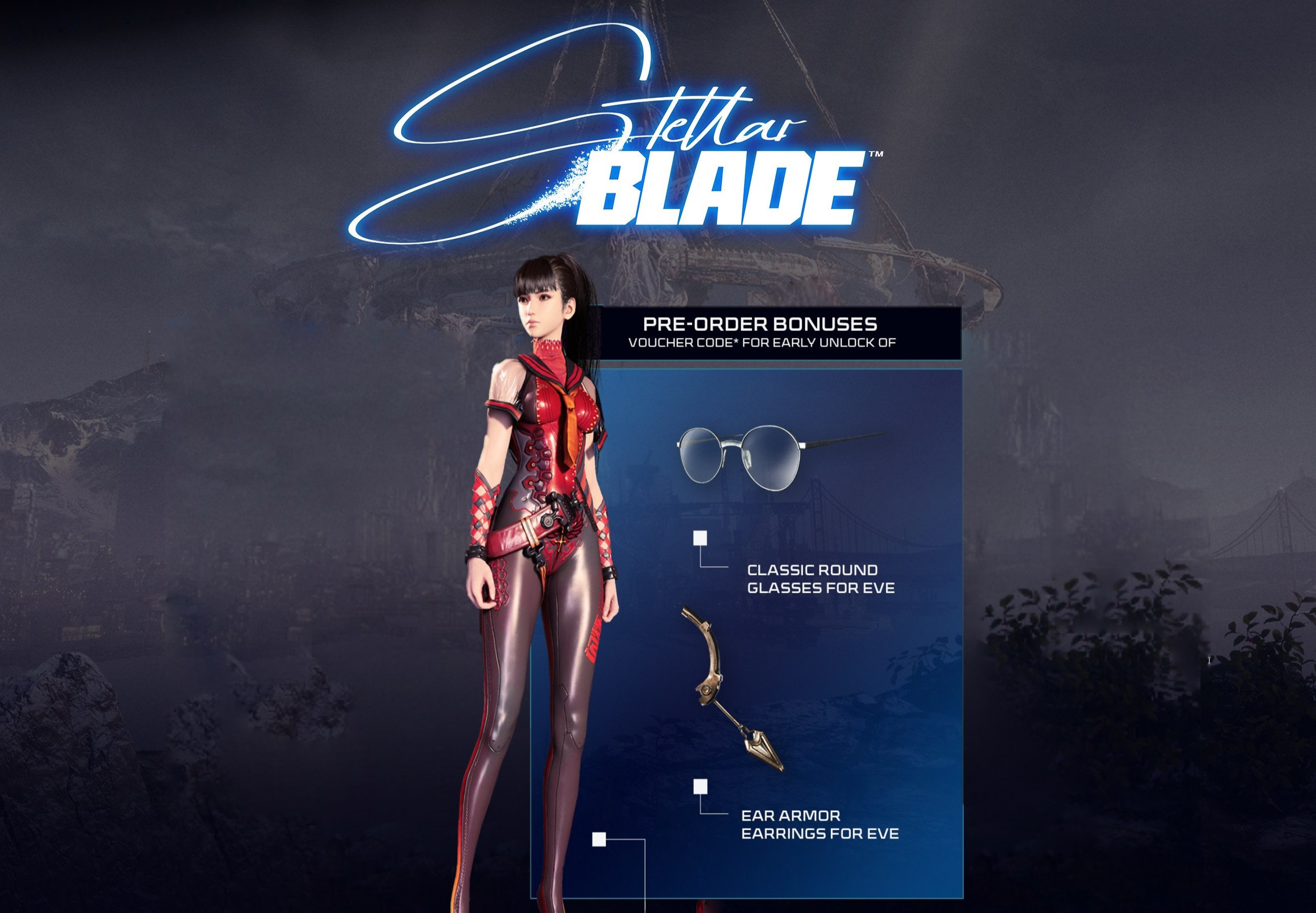 Bonus: Stellar Blade - Planet Diving Suit Stellar Blade - Classic Round Glasses Stellar Blade - Ear Armor Earrings Save humanity from extinction in this electrifying